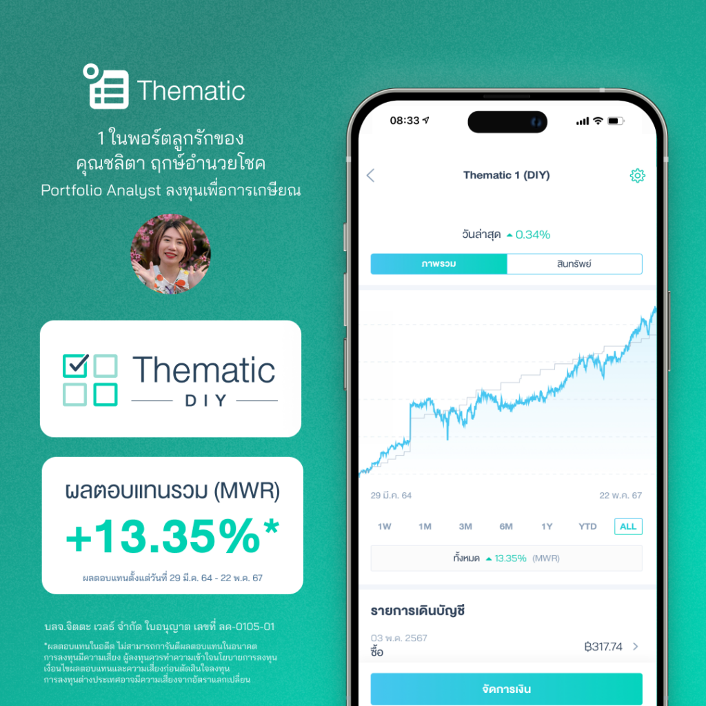 “ETF ที่ Jitta Wealth เลือกมาให้ลงทุนล้วนอยู่ใน Top10 ของธีมนั้นๆ อยู่แล้ว เราก็ลงทุนง่ายไม่ต้องเสียเวลาเลือกเอง ทำให้พอร์ต Thematic DIY ผลตอบแทน +13.35%”