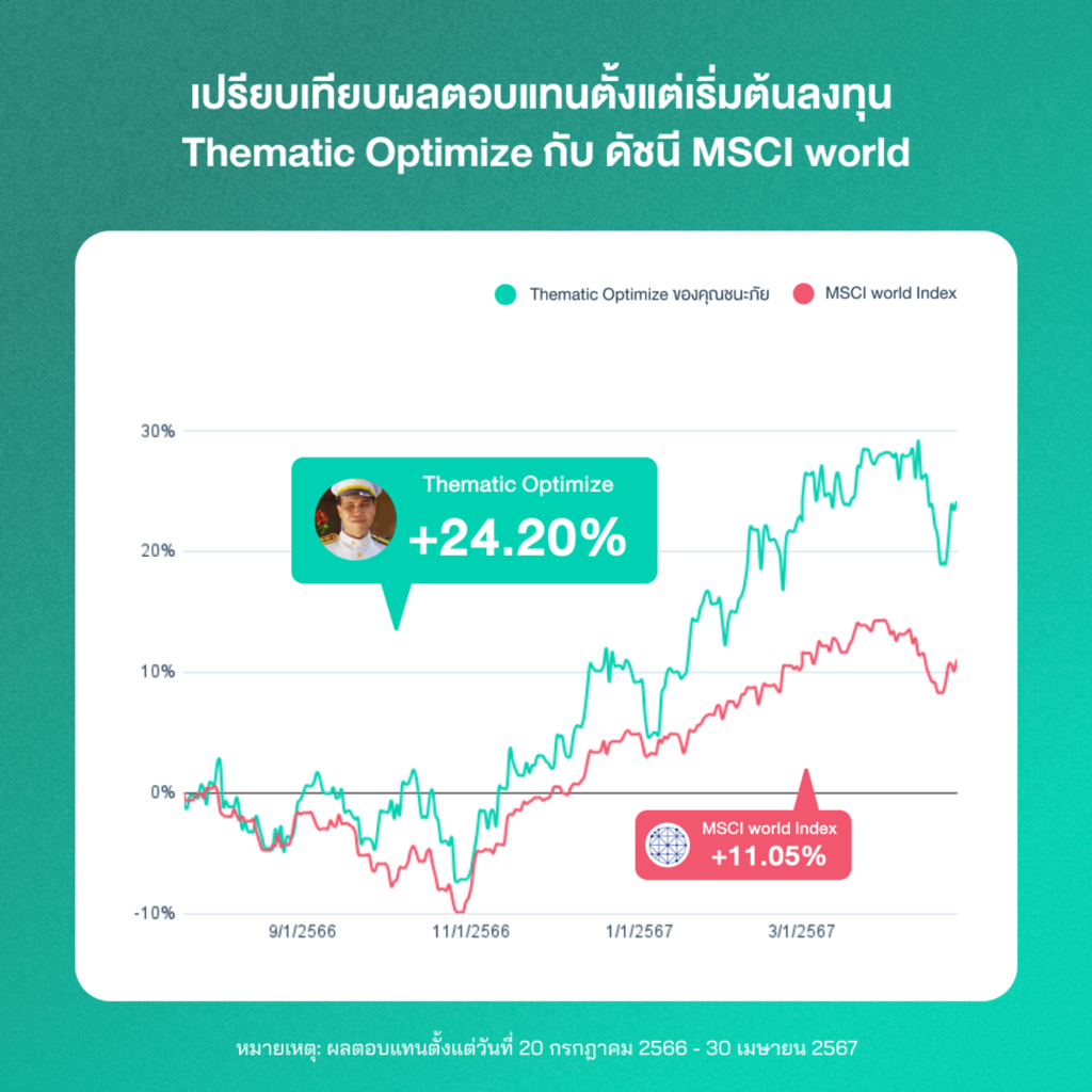 คุณชนะภัย จันทร์ดำ พนักงานหน่วยบริการนักศึกษาพิการ มหาวิทยาลัยรามคำแหง ที่อยากมาขอเล่าประสบการณ์เส้นทางลงทุน และประสบการณ์การลงทุนใน Thematic Optimize ผลตอบแทน +24.20% เอาชนะคู่เทียบอย่าง MSCI World TR ในช่วงเวลาเดียวกันที่ทำได้เพียง +11.05% (20 กรกฎาคม 2566 – 30 เมษายน 2567)
