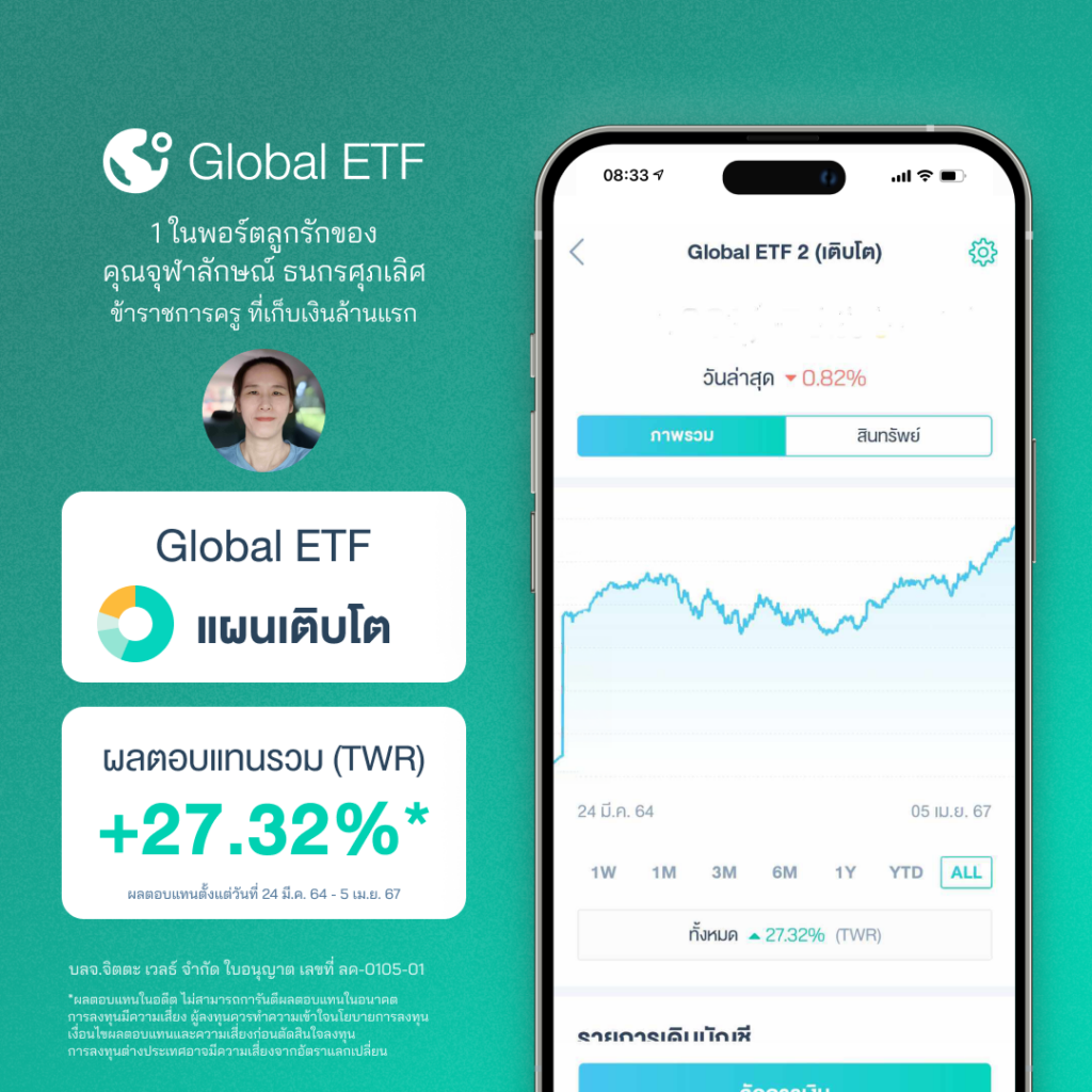 “การลงทุนไม่ใช่ว่าจะไม่ให้ขาดทุนเลย แต่หมายถึงว่าต้องลงทุนในสิ่งที่เรามั่นใจ อย่าง Global ETF ผลตอบแทนรวม +26.76%”