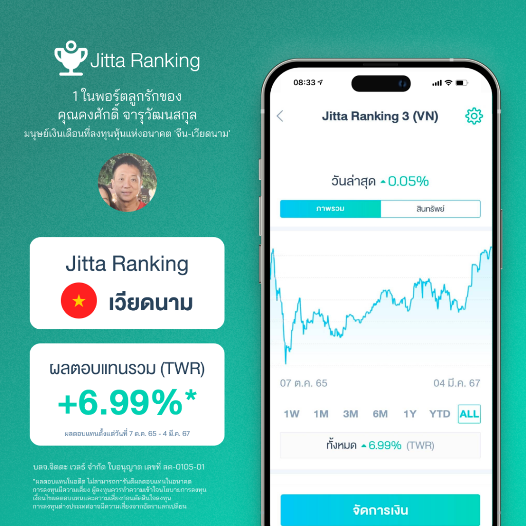 ก่อนจะเปิดพอร์ตกับ Jitta Wealth คุณเลือกพอร์ตลงทุนจากอะไร สำหรับคุณคงศักดิ์ จารุวัฒนสกุล มนุษย์เงินเดือนที่ต้องการลงทุนเพื่อเกษียณสุข เขาเลือกจากประเทศที่มีความเชื่อมั่นว่า จะมีการเติบโตในอนาคต เพียงแค่นั้นแล้วที่เหลือก็ปล่อยให้เป็นหน้าที่ของ Jitta Wealth คัดเลือกหุ้นดีราคาเหมาะสมจากประเทศดีๆ มาจัดพอร์ตลงทุนให้ ซึ่งผลตอบแทนที่ได้จากการลงทุนใน Jitta Ranking หุ้นเวียดนามของเขาก็อยู่ที่ 6.99% เริ่มฟื้นตัวตามตลาดหุ้นเวียดนาม