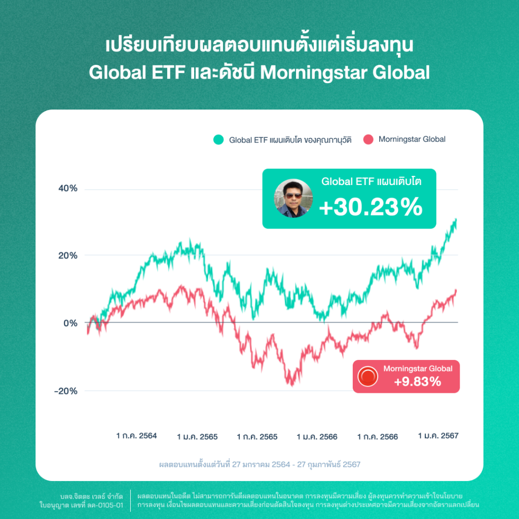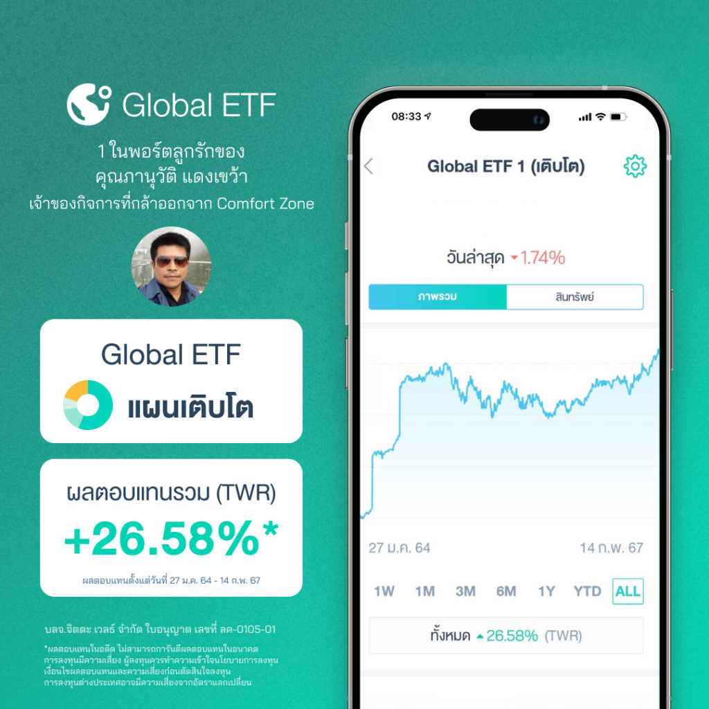 ทุกอย่างมีความเสี่ยง มีขึ้นมีลงได้ แต่ถ้าเงินที่ลงทุนเป็นเงินเย็น เราจะไม่จิตตก ด้วยพอร์ตGlobal ETF ผลตอบแทนรวม +30.23%*
