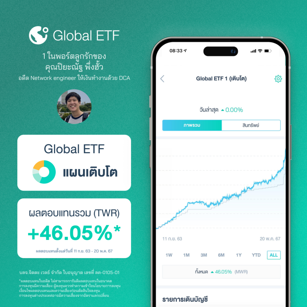 คุณปิยะณัฐ พึ่งฮั้ว อดีต Network engineer ผู้มุ่งมั่นให้เงินทำงานด้วยการ DCA กับ Global ETF ผลตอบแทนรวม +44.45%