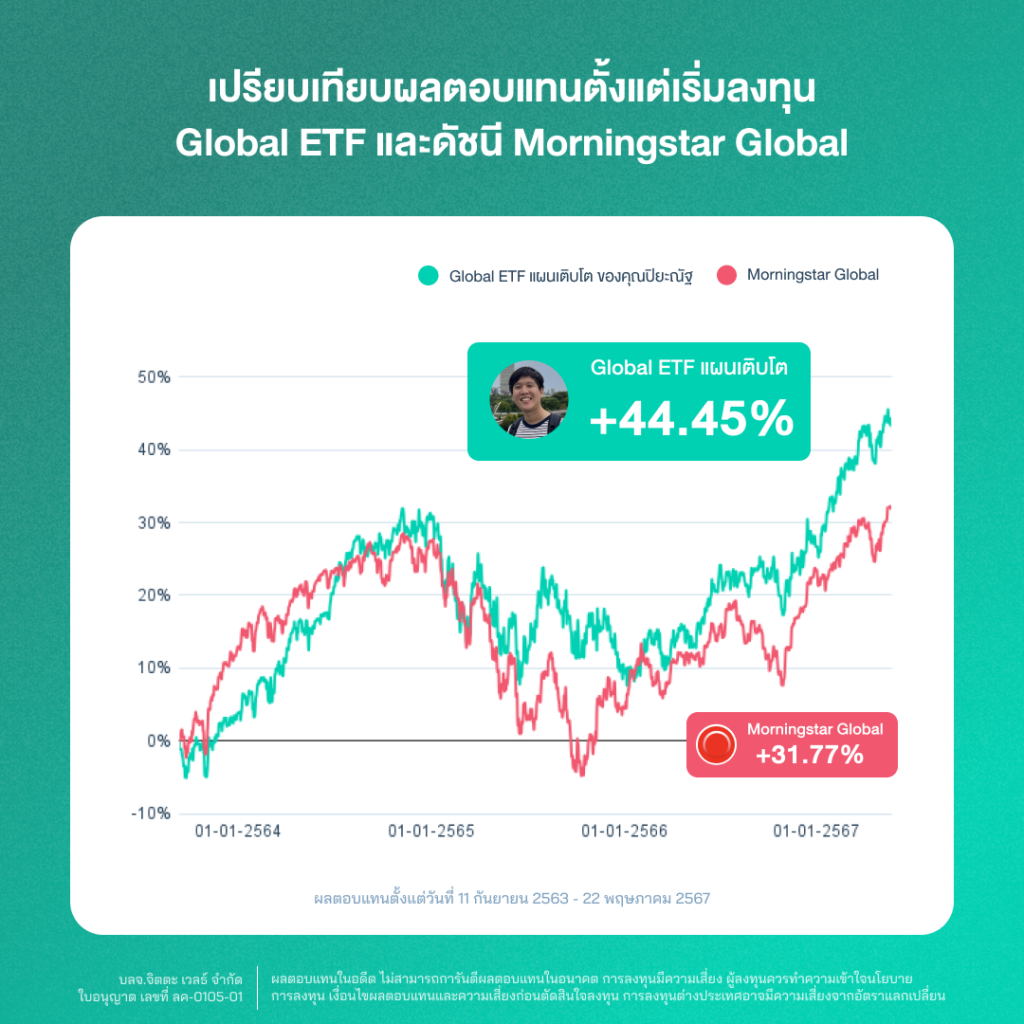 “ยิ่งเราสม่ำเสมอ และเลือกความเสี่ยงที่ไม่มากเกินไป พอร์ตมีเสถียรภาพสุดท้ายสินทรัพย์ก็งอกเงยได้อย่างสบายใจ Global ETF ผลตอบแทนรวม +44.45%”