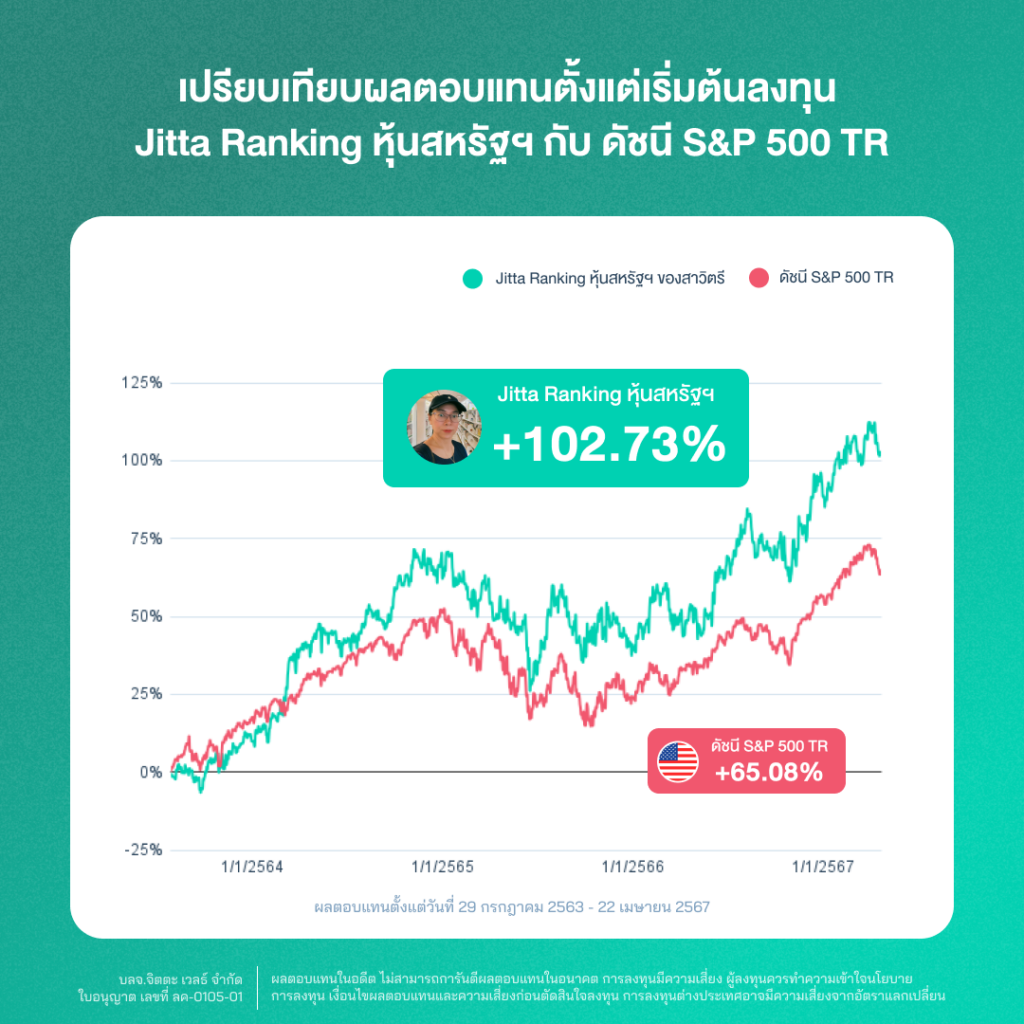 ทุกวันนี้พอร์ต Jitta Ranking หุ้นสหรัฐฯ ของคุณสาวิตรี ที่ลงทุนมาแล้ว 3 ปีเศษ ตั้งแต่วันที่ 29 กรกฎาคม 2563 ถึง 22 เมษายน 2567 สร้างผลตอบแทนไปแล้ว 102.73% เอาชนะดัชนี S&P 500TR ที่สร้างผลตอบแทนได้เพียง 65.08% ในช่วงเวลาเดียวกัน