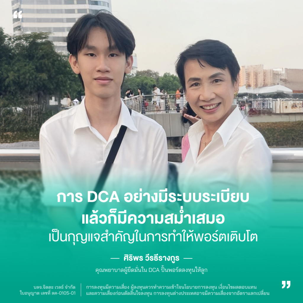 เพราะสำหรับคุณศิริพร การเตรียมเงินไว้เพื่อลูก มิใช่เพียงเก็บเงินแล้วส่งต่อเท่านั้น ทุกครั้งที่เธอศึกษาเรื่องการลงทุน เธอมักจะแบ่งปันความรู้ให้กับลูก เพื่อสร้างความตระหนักและรับรู้ถึงความสำคัญในการบริหารเงินลงทุน ซึ่งลูกก็สนใจและเรียนรู้การวางแผนการเงินไปพร้อมกัน ด้วยความที่ลูกชายกำลังเรียนวิศวะฯ คอมพิวเตอร์ เรื่องตัวเลขจึงถือว่าถนัดไม่น้อย เมื่อได้เรียนรู้ไปพร้อมกับแม่ทำให้เขารู้จักเรื่องของอัตราดอกเบี้ยทบต้น กฎของตัวเลข 72 และเมื่อเขาได้ลองคำนวนด้วยสูตรทางการเงิน จากเงินลงทุนเริ่มต้นและการ DCA อย่างต่อเนื่องก็ได้ค้นพบว่าเงินลงทุนจะมีมูลค่ามหาศาลอย่างไรในอนาคต คุณศิริพรจึงตั้งใจว่าจะ DCA ต่อไปจนกว่าลูกทำงานและรับไม้ต่อไปดูแลพอร์ตเอง