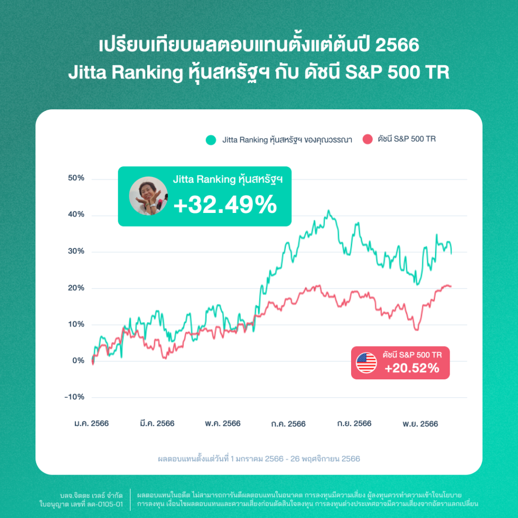 พอร์ตลงทุนของคุณวรรณาใน Jitta Ranking หุ้นสหรัฐฯ สร้างผลตอบแทนได้ดีเหนือตลาด โดยตั้งแต่ต้นปี 2566 มาถึง 26 พฤศจิกายน 2566 ผลตอบแทนอยู่ที่ 32.49% เทียบกับ S&P 500 index ในช่วงเวลาเดียวกันที่สร้างผลตอบแทนได้เพียง 20.52% เรียกว่า Jitta Ranking ชนะขาด