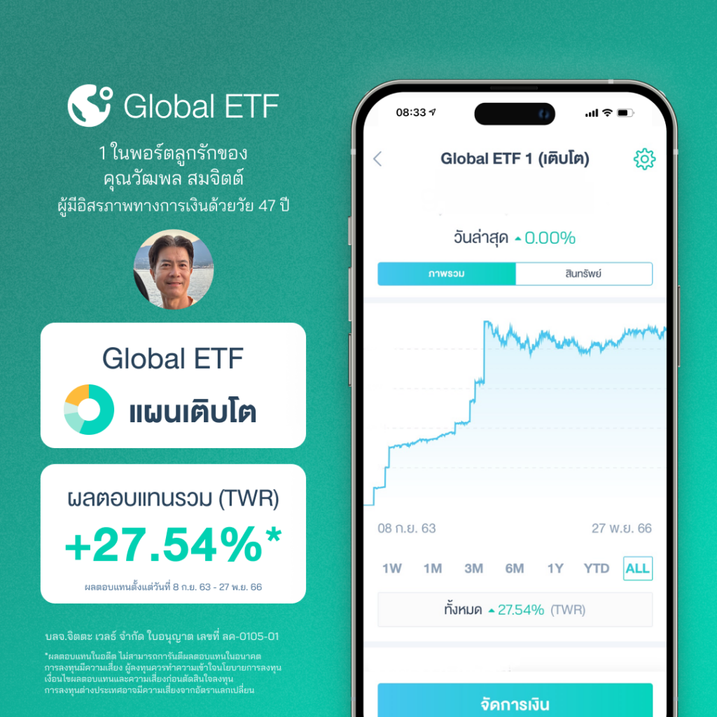 และสำหรับพอร์ตลูกรักของคุณวัฒพลหนีไม่พ้น Global ETF(เติบโต) เพราะเชื่อมั่นในอัตราผลตอบแทนที่สอดคล้องกับความเสี่ยงในการลงทุน ในหุ้นทั้งตลาดและมีส่วนผสมของตราสารหนี้ในระยะยาว โดยปล่อยให้พอร์ต Global ETF นี้ ขึ้นลงบ้างตามธรรมชาติที่จะต้องเป็นในระยะสั้นแต่จะสามารถเติบโตไปได้เรื่อยๆ ในระยะยาว ยาวนับเป็นสิบๆ ปี ข้างหน้า