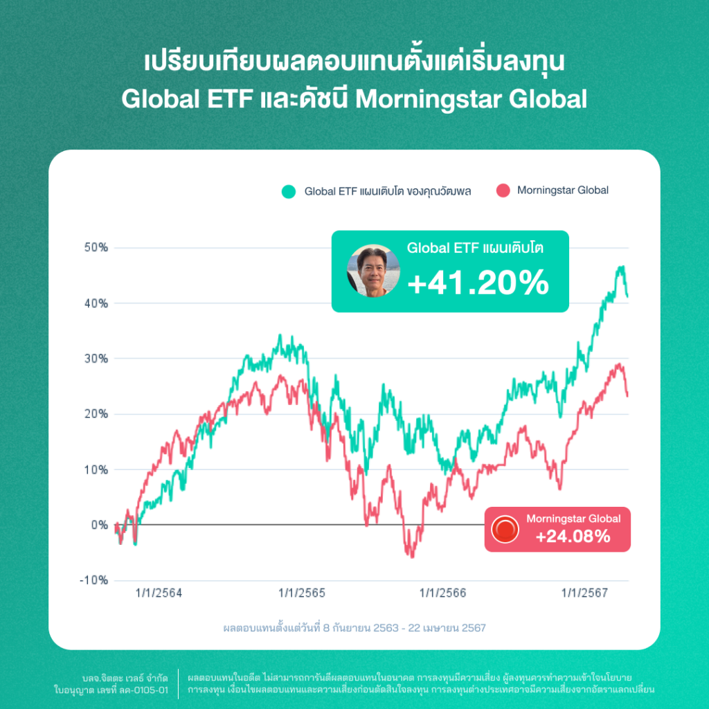 การลงทุนในกองทุนดัชนี ไม่ได้สร้างผลตอบแทนที่น้อยอย่างที่คิด วันนี้เราจะมีพอร์ตดีๆ ของคุณวัฒพล สมจิตต์ อดีตนักบริหารความเสี่ยงองค์กร ที่ลงทุนใน ใน Global ETF มาตั้งแต่วันที่ 8 กันยายน 2563 ด้วยความเชื่อมั่นในการลงทุนระยะยาวผ่านกองทุนดัชนีในตลาดหุ้นสหรัฐฯ และหมั่นเติมพอร์ตอยู่เสมอ ผ่านมา 3 เศษก็ได้เห็นตัวเลขผลตอบแทนที่ระดับ 41.20% (ณ วันที่ 22 เมษายน 2567) สูงกว่า MorningStar Global 80/20 ในช่วงเวลาเดียวกันที่ 24.08%